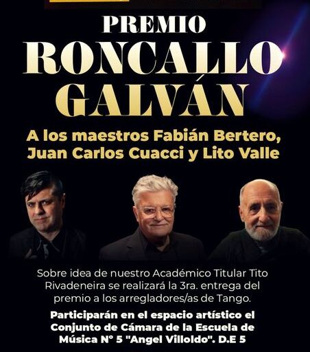 Fabián Bertero, Juan Carlos Cuacci y Lito Valle, músicos de amplia trayectoria, recibieron el Premio Roncallo-Galván, distinción con la que la Academia Nacional del Tango distingue anualmente a los mejores arregladores musicales. La labor de estos artistas es muy valorada en su ambiente, aunque son poco conocidos para el público común.