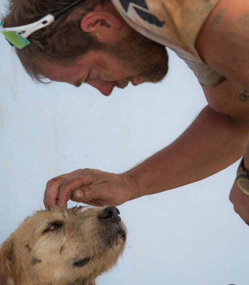 En una de las zonas de descanso para los corredores, se cruza con un perro callejero, lo alimenta y sigue tras su objetivo. Pero más adelante vuelve a verlo, como si lo hubiera estado esperando.