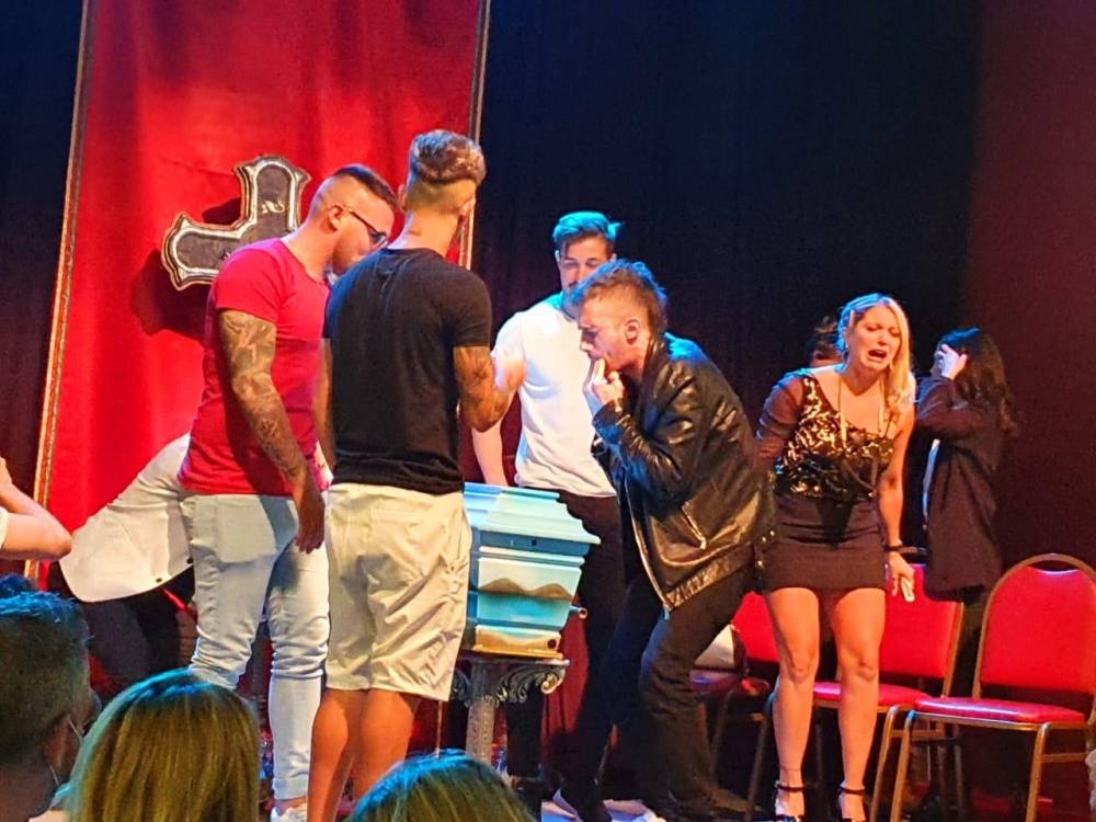 ¿Por qué sucede esto con la obra? Probablemente porque de verdad apuesta a que el público participe y se sorprenda, y prueba de ello es que la obra empieza «antes de que empiece»: estábamos subiendo las escaleras para entrar a la sala y de pronto tuvimos que abrir paso para cuatro personas que, a los gritos, intentaban bajar un féretro que parecía pesar mucho.