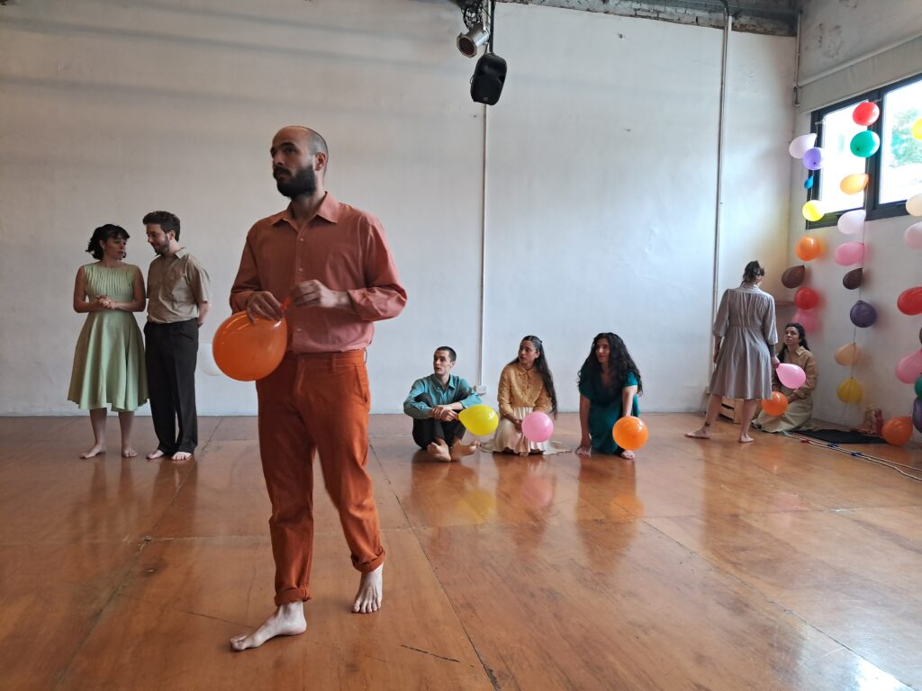 La escenografía es tremendamente simple: un amplio piso, sin mobiliario, a la par de las butacas para el público, donde los artistas se desplazan, caminan, bailan, se abrazan, se besan, corren, saltan, se agreden y van desarrollando sus breves diálogos. No hay iluminación, la luz se introduce a través de un ventanal situado a un extremo. Y los elementos que adornan el escenario son muchos globos, infaltables en toda fiesta, una pequeñísima casita, una guitarra, algunos juguetes y palos cilíndricos de artistas callejeros. La música proviene de una notebook. Recursos tan simples como efectivos.