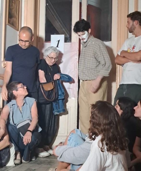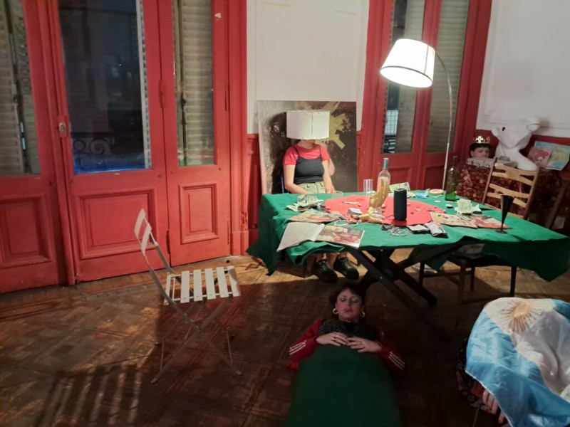 La gente primero hace una recorrida por el amplio piso de la casona para ambientarse y ver el ecléctico decorado, donde los trece actores y actrices –Micaela Brillo, Fede Burgos, Yasmin Eisenberg, Anna Fantoni, Delfina Gonzales Chaves, Delfina Granero, Federico Heinrich, Maia Lis, Luna Mazzeo, Olivia Nuss, Federico Pezet, Federico Rojas– están absolutamente estáticos y camuflados con el decorado.