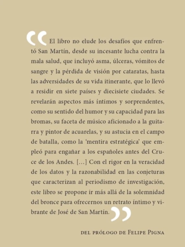 El libro revela a un San Martín en sus vínculos afectivos. Como era la relación con sus padres, con cada uno de sus hermanos, con su mujer, con su hija, con sus nietas, con sus amigos y con sus enemigos. Espero haber logrado un buen retrato de cómo era su personalidad. Una persona de un carisma irresistible, de gran humor, con un poder de persuasión increíble. Una persona afectuosa, generosa. Un demócrata y un defensor de la soberanía a toda prueba. Una persona que cruzó ocho veces la Cordillera de los Andes, algunas en condiciones muy adversas. Una persona que vivió en diecisiete ciudades de siete países.