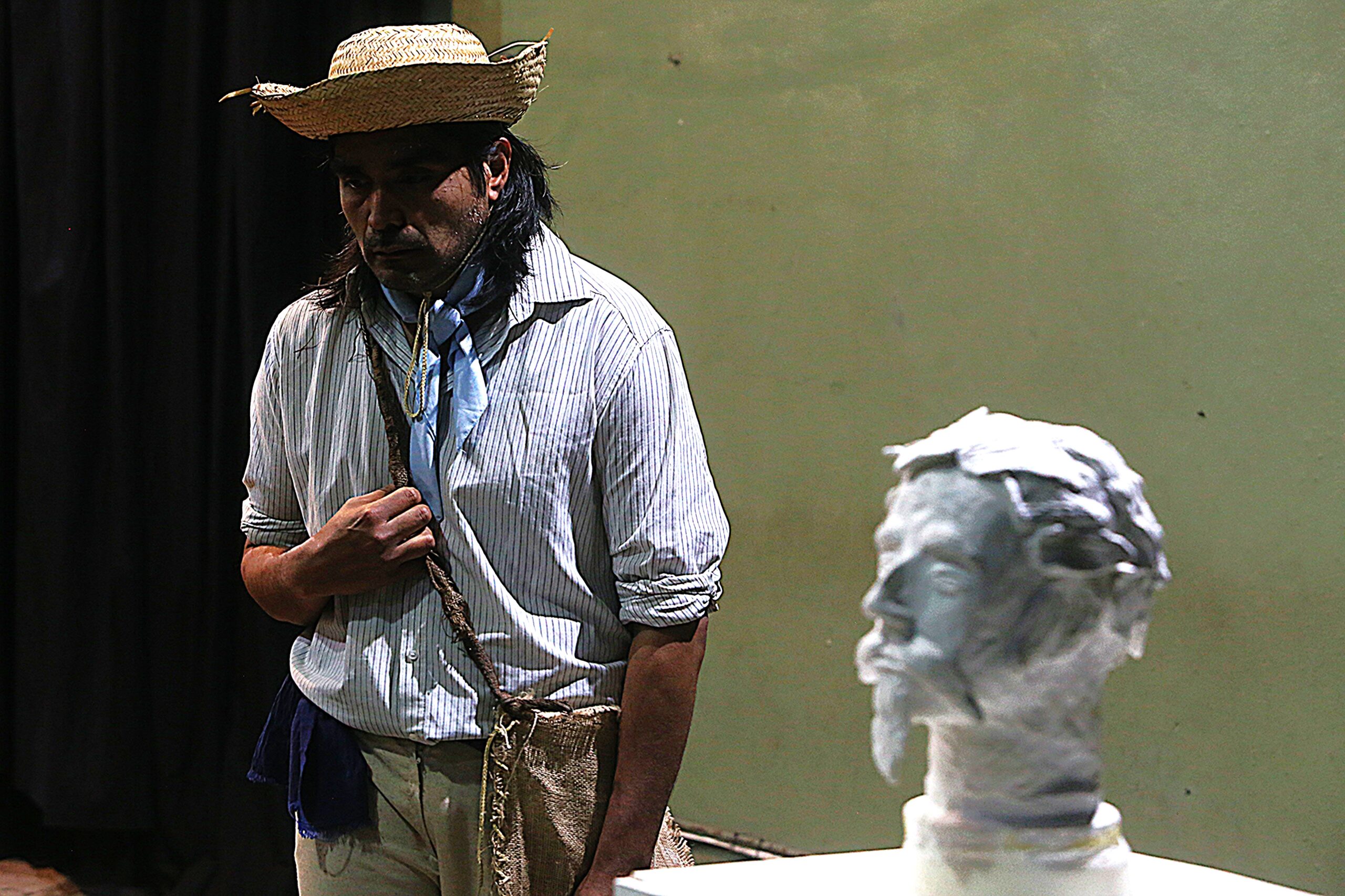 La obra trata de lo que queremos como sociedad, qué queremos como país. Por eso el tema de la estatua, que nadie sabe quién es, porque al no tener un prócer, es como que no hay una identidad como pueblo. Un poco esa era la idea que trabajaba. Nadie sabe quién es, mejor dicho, hay uno sólo que sí sabe. Y los demás, cada uno tiene su ficción en la cabeza. Se nombran algunos personajes que ideológicamente son diversos; cada uno lo ve desde su ángulo y está, perfecto-Así que la estatua, un elemento estético, la utilizamos para eso, para mostrar un poco la falta de identidad como pueblo. Y también la falta de horizonte.